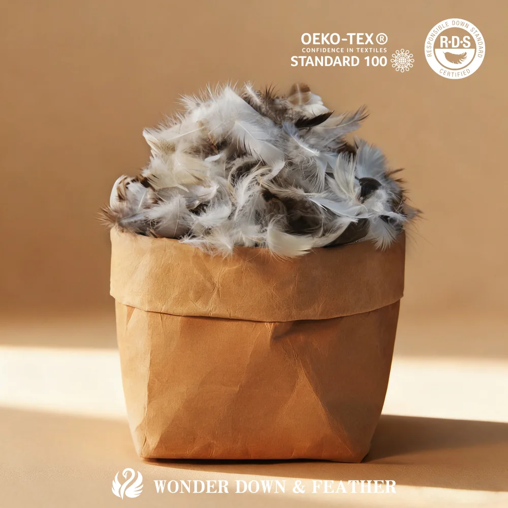 Based in Lu'an, China's down and feather processing hub, we maintain complete vertical control over our grey duck feather supply chain. We source and process grey duck feathers with the same rigorous standards as our white feather products, while offering the distinct advantage of natural grey coloration that eliminates show-through in dark-colored applications.